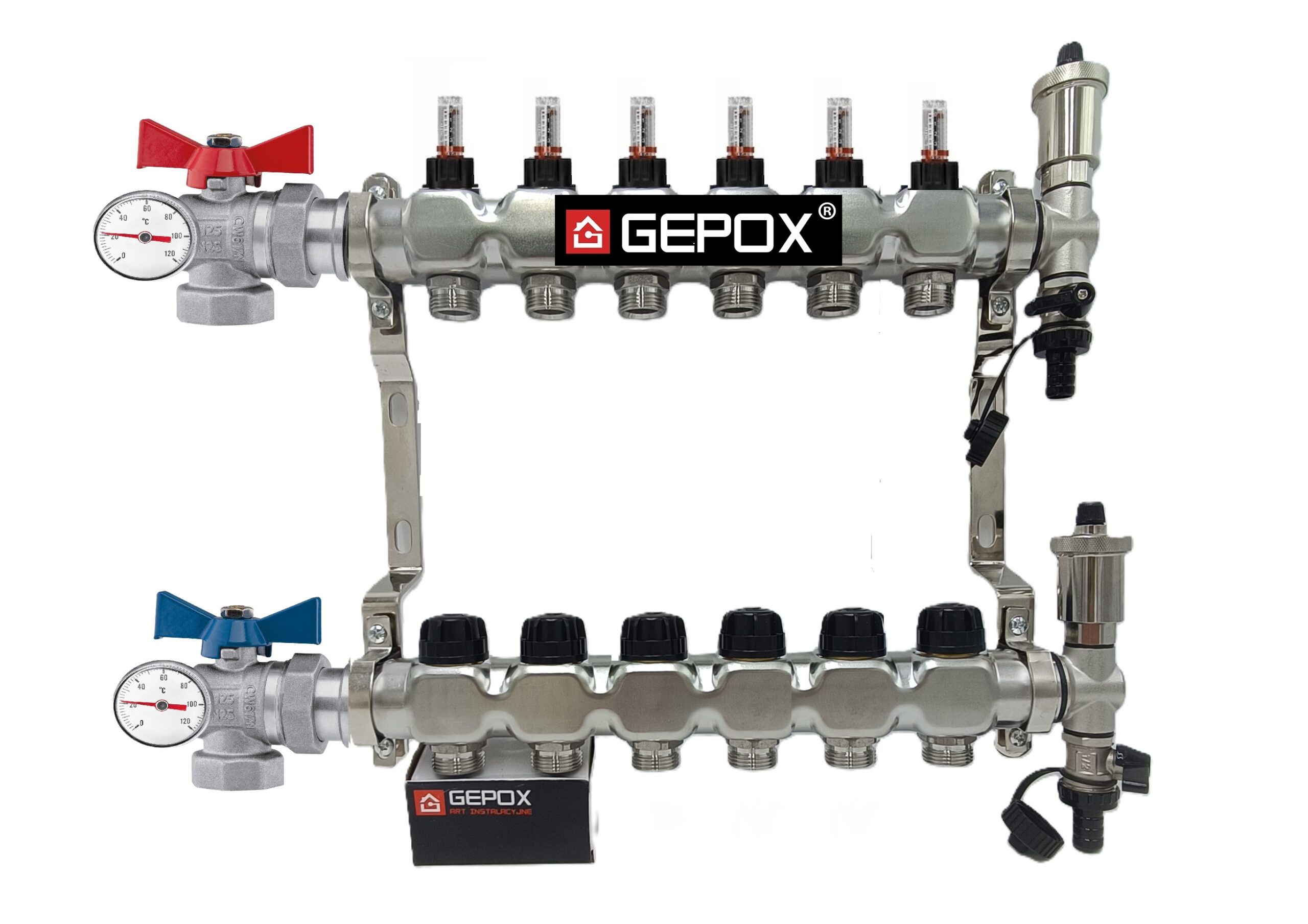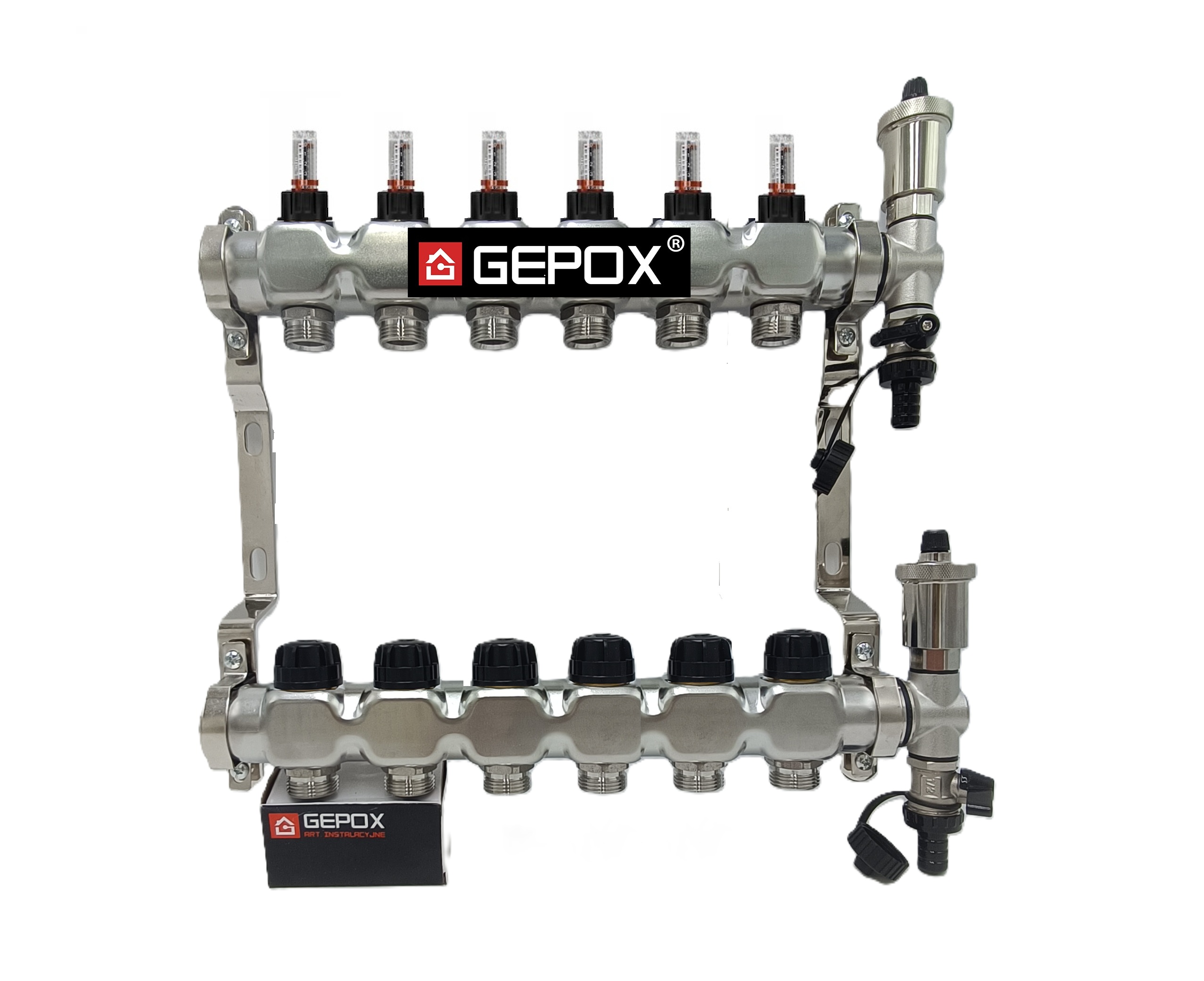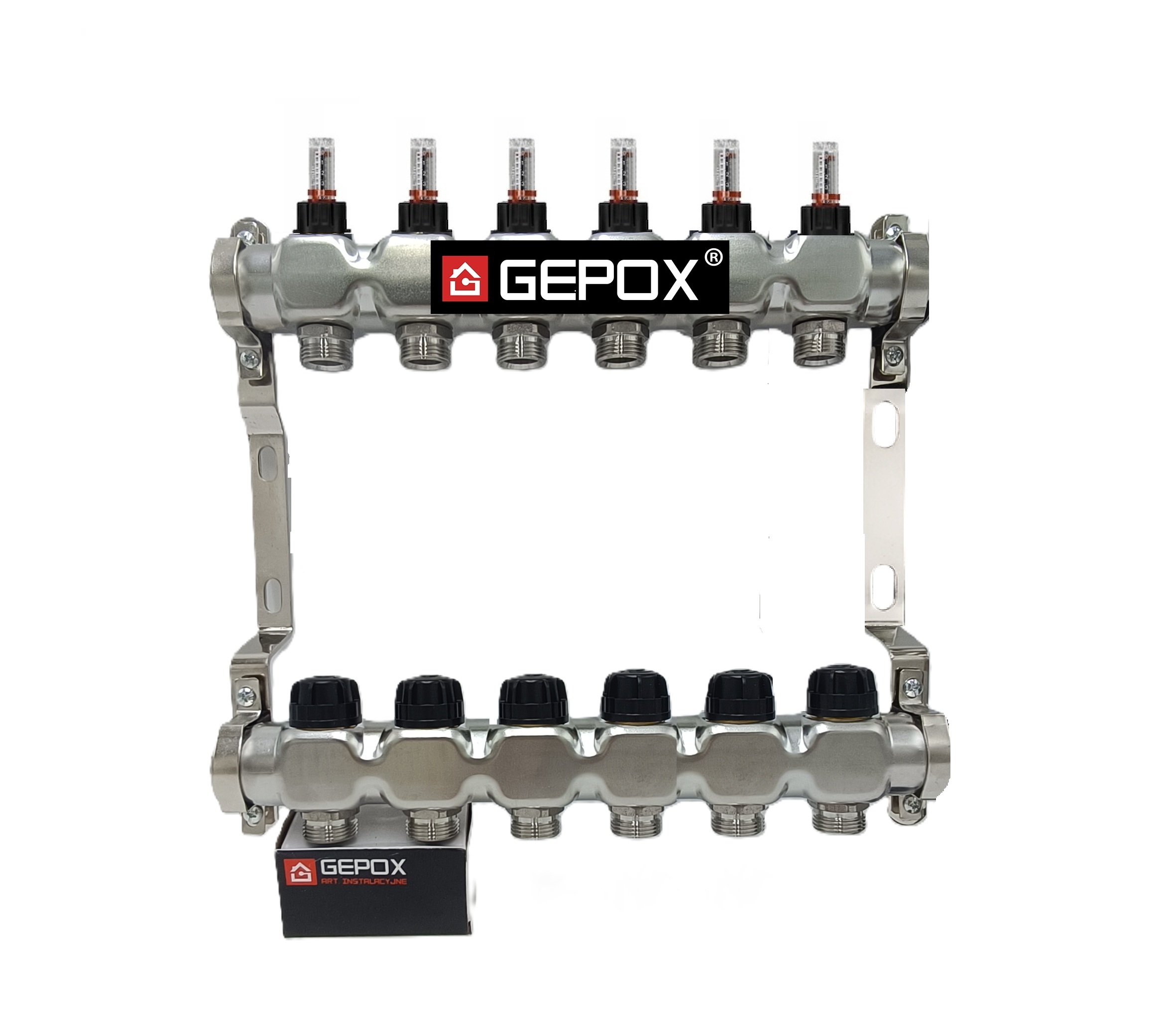 Rozdzielacze do ogrzewania płaszczyznowego, w tym podłogowego, linii produktowej GEPOX PRO i GEPOX PREMIUM produkowane ze stali nierdzewnej w zakresie od 2 do 12 obwodów.