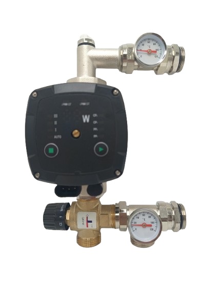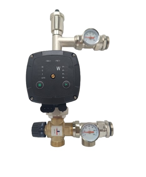Mosiężne zestawy mieszające (grupy mieszające) składają się z pompy obiegowej, zaworu trójdrożnego (bimetal), termometrów i zaworu odpowietrzającego.